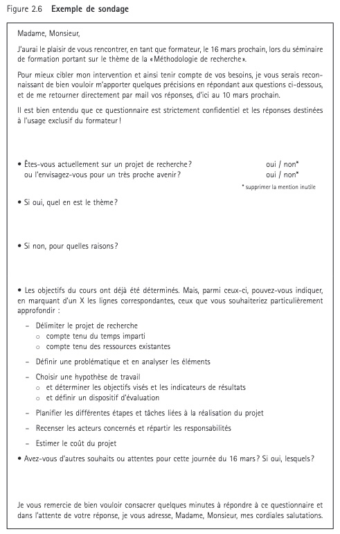 Le but et le thème de la formation sont connus et correspondent à une nécessité avérée. Sonder les futurs participants à un séminaire pour connaître les points sur lesquels ils souhaitent être formés.