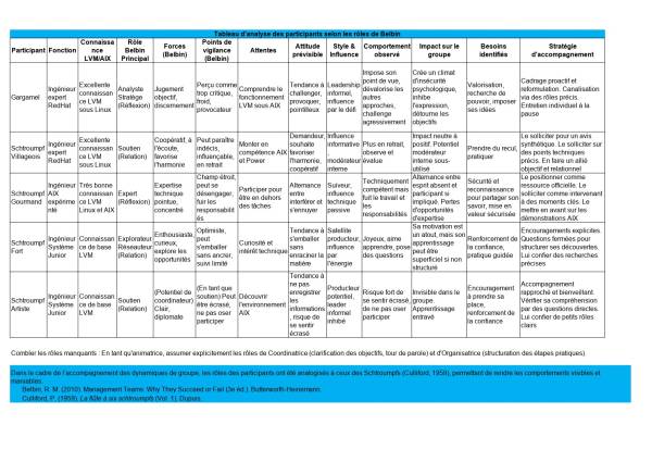 L'analyse des rôles m'est apparue comme un nouvel axe stratégique pour comprendre, puis transformer la dynamique. J'ai mené une analyse approfondie des rôles durant 2 mois au sein du petit groupe que je forme en continu, fondée sur une observation quotidienne factuelle (voir Annexe 1).